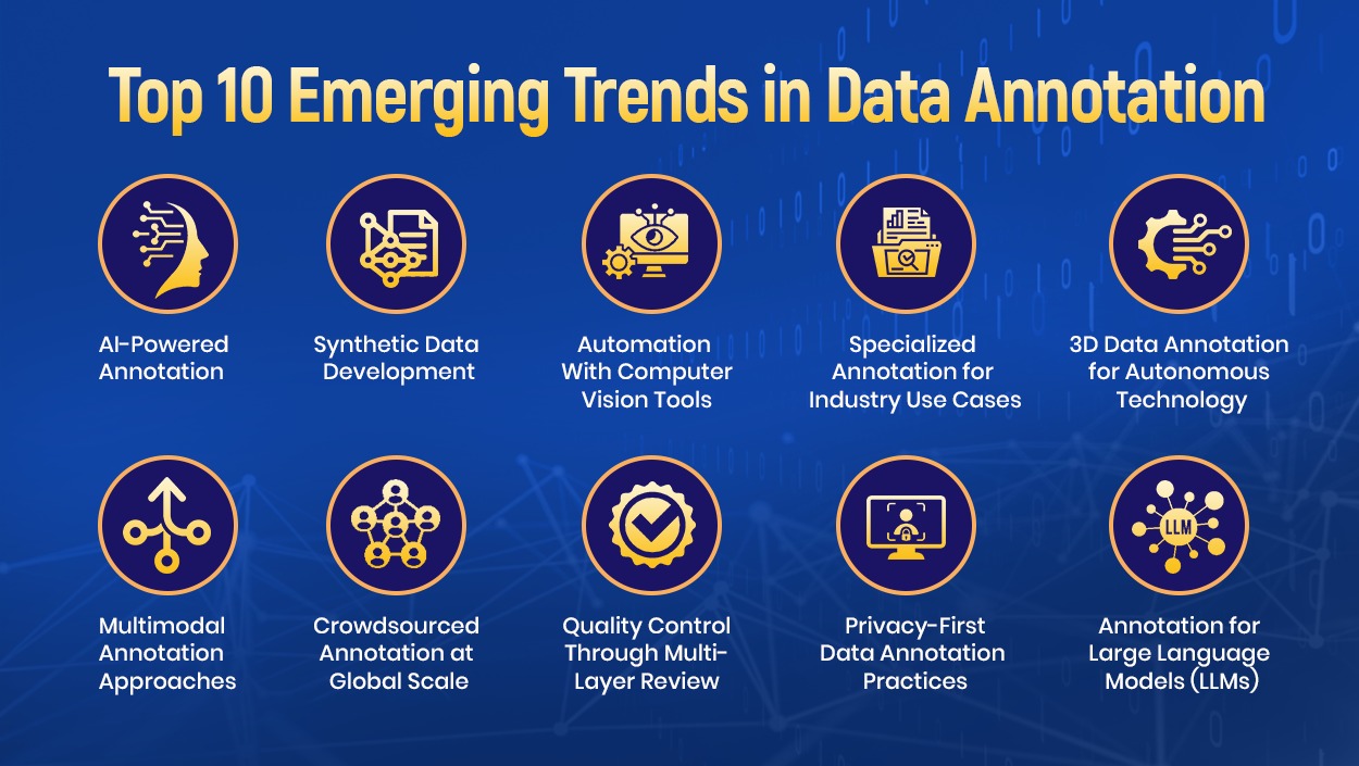 In this blog, we explore the top 10 data annotation trends, upcoming shifts in the field, future technologies that will change data annotation, and what businesses should prepare for next.